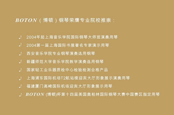 BOTON(博頓)鋼琴自2003年進入中國市場以來,特約授權上海薩瑟鋼琴有限公司為國內唯一生產供貨商。16年來始終堅持“真琴感動世界,品質鑄造品牌”的品牌戰略。和“專業專注,精益求精;競爭品質,服務愛心”的經營理念。絕不參與行業泛濫的互聯網品牌造假;不搞百度“競價排名”;不搞國產配件海運東南亞落后國家簡易拼裝再返的“洗澡式”“原裝進口”。BOTON(博頓)鋼琴高瞻遠矚,求真務實,以高度的品牌使命感和社會責任感為己任,有底線,有擔當。為廣大用戶只提供高品質專業鋼琴。品質承諾:質保三十年,實施召回制,并在官網和微信公眾平臺公示具人性化可操作體細則。特設全國統一監督、服務、投訴專線:400-110 7866.