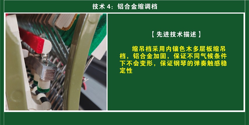 BOTON(博頓)鋼琴為了防止因為溫度、濕度、干寒、暖氣輻射引發的中盤變形,特別使用了專業定制的"T型鋁”、“加強型大槽鋼”并采取中盤三段式鋸斷,取槽鑲嵌“T型鋁”,對敲大邦檔槽鋼,以對敲螺絲鎖死的固定辦法,確保了極端環境下鋼琴的正常使用。