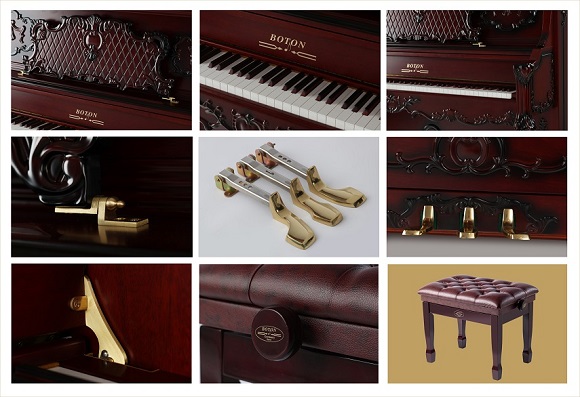 BOTON(博頓)鋼琴采用不等厚非對稱曲面分布,加強低音的共鳴,各音區音色連貫、統一和飽滿。
