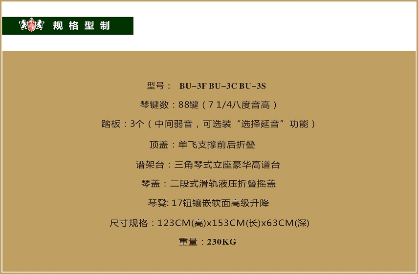 尊敬的用戶,熱烈歡迎您已成為勃拉姆斯 Brahms 鋼琴用戶大家庭中的一員,祝賀您以睿智的目光選擇了我們的產(chǎn)品,我們將為您提供卓越的品質(zhì)和一流的服務(wù)。Brahms 鋼琴從進(jìn)入中國大陸20年以來,在各項(xiàng)技術(shù)指標(biāo)和制作工藝上都嚴(yán)格按照德國鋼琴工藝標(biāo)準(zhǔn)生產(chǎn)制造,迄今為止已在生產(chǎn)和銷售方面有了長足的發(fā)展,特別是在產(chǎn)品質(zhì)量上多項(xiàng)指標(biāo)已遠(yuǎn)遠(yuǎn)超過中國樂器行業(yè)國家標(biāo)準(zhǔn)和同行水平。現(xiàn)已被作為上海音樂學(xué)院國際鋼琴大師班演奏用琴;美國奧柏林國際鋼琴大賽中國賽區(qū)指定用琴;上海國際書展專家指定演示用琴;上海浦東國際機(jī)場(chǎng)T2航站樓迎賓大廳形象展示指定用琴;廈門高崎國際機(jī)場(chǎng)迎賓大廳形象展示用情等。在銷售商和消費(fèi)者心目中已經(jīng)建立起了良好的品質(zhì)形象和信譽(yù),品牌效應(yīng)也日見彰顯。為了酬謝廣大Brahms 用戶的厚愛,確保Brahms 鋼琴的恒久卓越,我們特聯(lián)合特約經(jīng)銷商向 Brahms 用戶提供:1、電話定時(shí)回訪;2、上門跟蹤服務(wù);3、特設(shè)咨詢和監(jiān)督投訴專線電話;4、對(duì)產(chǎn)品品質(zhì)的保障管理切實(shí)實(shí)行 “質(zhì)保30年,實(shí)施召回制”。