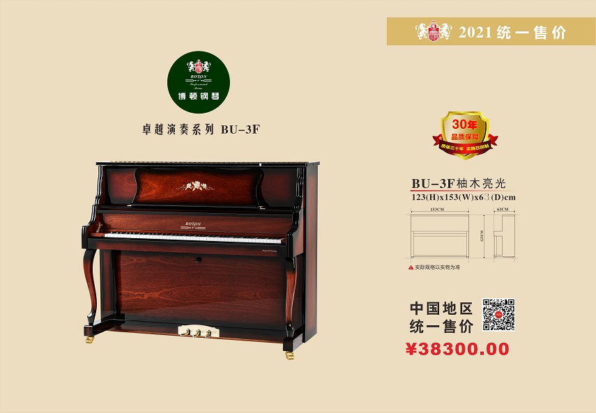 尊敬的用戶,熱烈歡迎您已成為BOTON(博頓)鋼琴用戶大家庭中的一員,祝賀您以睿智的目光選擇了我們的產(chǎn)品,我們將為您提供卓越的品質(zhì)和一流的服務(wù)。BOTON鋼琴從在中國大陸注冊(cè)成立生產(chǎn)十五年以來,在各項(xiàng)技術(shù)指標(biāo)和制作工藝上都嚴(yán)格按照德國鋼琴工藝標(biāo)準(zhǔn)生產(chǎn)制造,迄今為止已在生產(chǎn)和銷售方面有了長足的發(fā)展,特別是在產(chǎn)品質(zhì)量上多項(xiàng)指標(biāo)已遠(yuǎn)遠(yuǎn)超過中國樂器行業(yè)國家標(biāo)準(zhǔn)和同行水平。現(xiàn)已被作為上海音樂學(xué)院國際鋼琴大師班演奏用琴;西安音樂學(xué)院鋼琴系,新疆師范大學(xué)音樂學(xué)院,上海交響樂團(tuán)、合唱團(tuán)演奏用琴;美國奧柏林國際鋼琴大賽中國賽區(qū)指定用琴;上海國際書展專家指定演示用琴;上海浦東國際機(jī)場(chǎng)T2航站樓迎賓大廳形象展示指定用琴;廈門高崎國際機(jī)場(chǎng)迎賓大廳形象展示用情等。在銷售商和消費(fèi)者心目中已經(jīng)建立起了良好的品質(zhì)形象和信譽(yù),品牌效應(yīng)也日見彰顯。為了酬謝廣大BOTON用戶的厚愛,確保BOTON鋼琴的恒久卓越,我們特聯(lián)合特約經(jīng)銷商向BOTON用戶提供:1、電話定時(shí)回訪;2、上門跟蹤服務(wù);3、特設(shè)咨詢和監(jiān)督投訴專線電話;4、對(duì)產(chǎn)品品質(zhì)的保障管理切實(shí)實(shí)行“質(zhì)保30年實(shí)施召回制”。