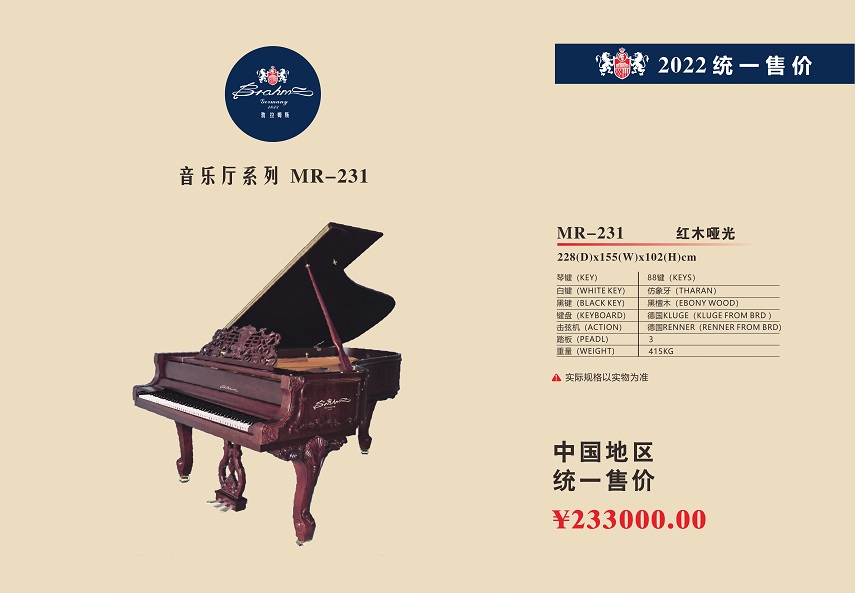 尊敬的用戶,熱烈歡迎您已成為勃拉姆斯 Brahms 鋼琴用戶大家庭中的一員,祝賀您以睿智的目光選擇了我們的產品,我們將為您提供卓越的品質和一流的服務。Brahms 鋼琴從進入中國大陸20年以來,在各項技術指標和制作工藝上都嚴格按照德國鋼琴工藝標準生產制造,迄今為止已在生產和銷售方面有了長足的發展,特別是在產品質量上多項指標已遠遠超過中國樂器行業國家標準和同行水平。現已被作為上海音樂學院國際鋼琴大師班演奏用琴;美國奧柏林國際鋼琴大賽中國賽區指定用琴;上海國際書展專家指定演示用琴;上海浦東國際機場T2航站樓迎賓大廳形象展示指定用琴;廈門高崎國際機場迎賓大廳形象展示用情等。在銷售商和消費者心目中已經建立起了良好的品質形象和信譽,品牌效應也日見彰顯。為了酬謝廣大Brahms 用戶的厚愛,確保Brahms 鋼琴的恒久卓越,我們特聯合特約經銷商向 Brahms 用戶提供:1、電話定時回訪;2、上門跟蹤服務;3、特設咨詢和監督投訴專線電話;4、對產品品質的保障管理切實實行 “質保30年,實施召回制”。